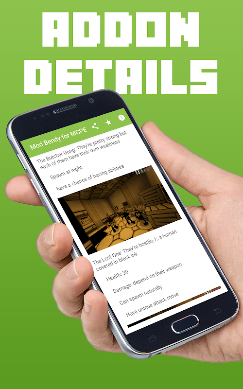 Mod Bendy for MCPE is here to help you easily install Bendy And The Ink Machine Add-on into your Minecraft Pocket Edition! With our 1-Click Install, you'll be able to download and install Bendy And The Ink Machine Mod in Minecraft PE game fast and easy in 1 single tap! Save time downloading, more time enjoying with friends and family :)