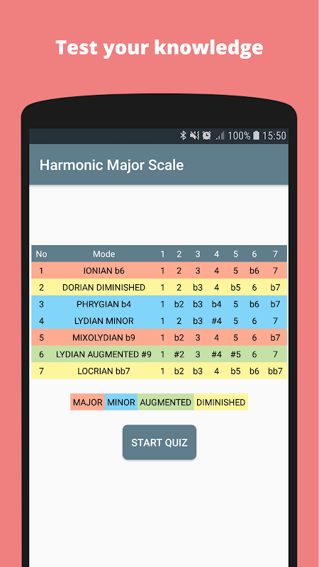 This app is a simple guide and quiz intended to help you become familiar with the most commonly used modal scales in jazz and classical music. The main diatonic scales are included. These are the Major, Harmonic Minor, Harmonic Major and Melodic Minor scales.