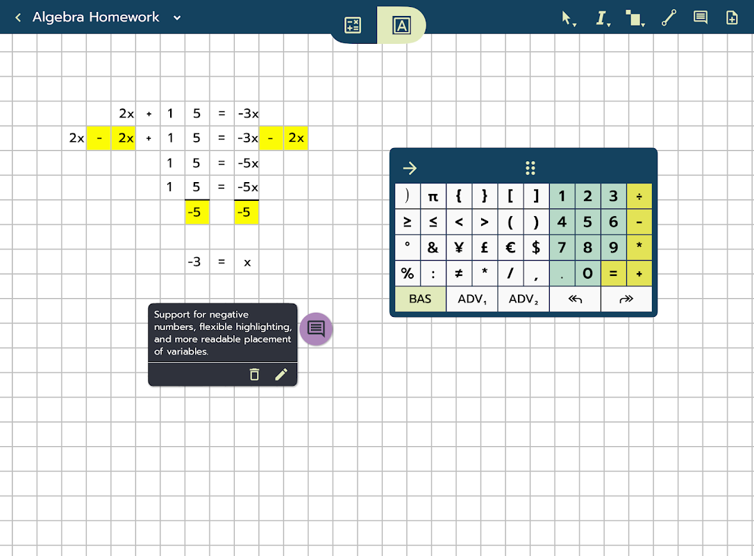 - Write and solve equations using an intuitive and accessible keypad, custom designed to reduce frustration and improve legibility.