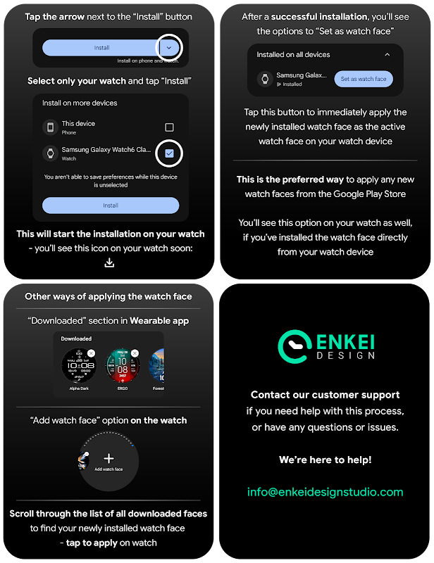 Open Play Store app from your watch or web browser to find and purchase this watch face, or use our provided phone companion app!
