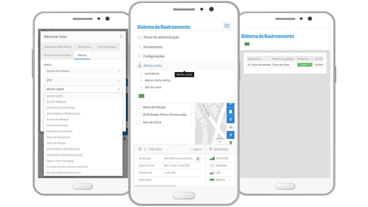 Receba notificações de seus veículos sobre: Excesso de velocidade, cercas, Ignição,