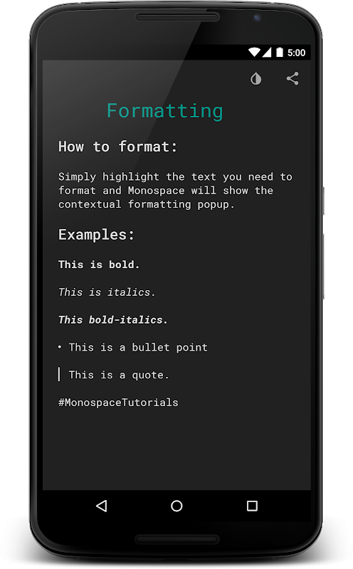 Monospace Writer supports Bold, Italics, Strikethrough, Bullet, Quote and a bunch of size related formatting styles.