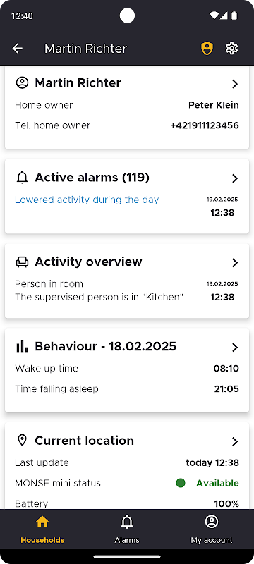 A long-distance care solution for family members whose seniors or disabled members live alone. It will send you an alert in the form of an SMS, e-mail, or notification if the monitored household experiences a crisis situation, and you can react quickly.