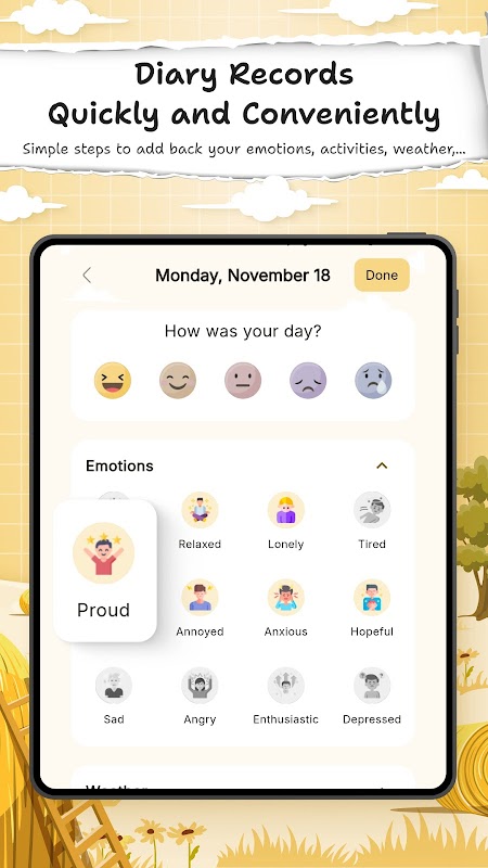 Keep track of your emotional ups and downs effortlessly. Record your feelings, daily activities, and events with simple steps, helping you build a full picture of your days and better understand your emotional well-being over time.