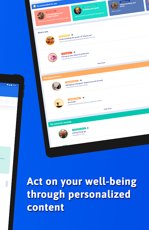 • Act on your well-being: advice sheets and personal development programs will allow you to directly act on the factors that impair your well-being and consolidate the factors that promote your well-being.