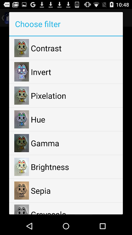 This app has about 40 filters such as 'Brightness','Contrast','Blur','Sharpening','Sepia','Monochrome','Edge detection', 'Sketch' and so on.