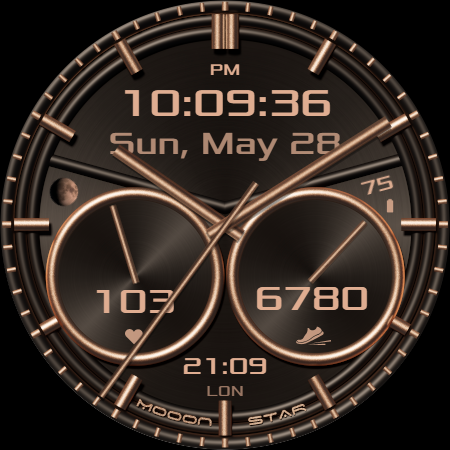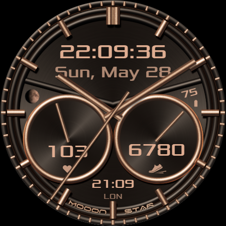 Minimalist style watch face with moon phases, date, analog and digital clock.