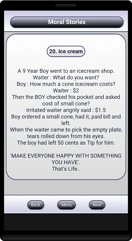 Moral Stories app have all kinds of stories like inspirational, funny stories, witty stories, motivational stories, spiritual stories and lot more. We have create this app with lot of passion and love, please rate this app if you like it.