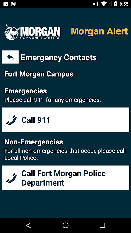 Morgan Alert is the official safety app of Morgan Community College. It is the only app that integrates with Morgan Community College's safety and security systems. Campus Security has worked to develop a unique app that provides students, faculty and staff with added safety on the Morgan Community College campus. The app will send you important safety alerts and provide instant access to campus safety resources.