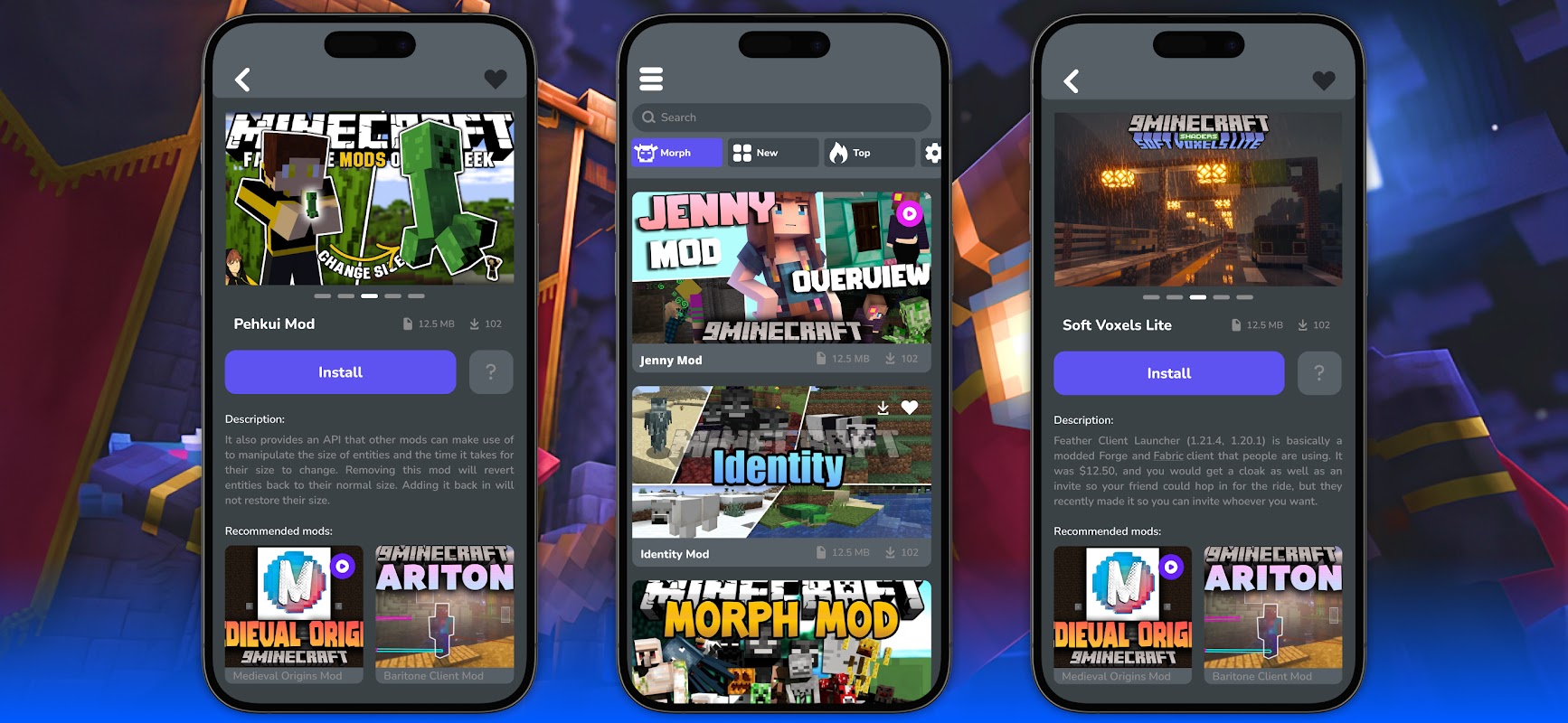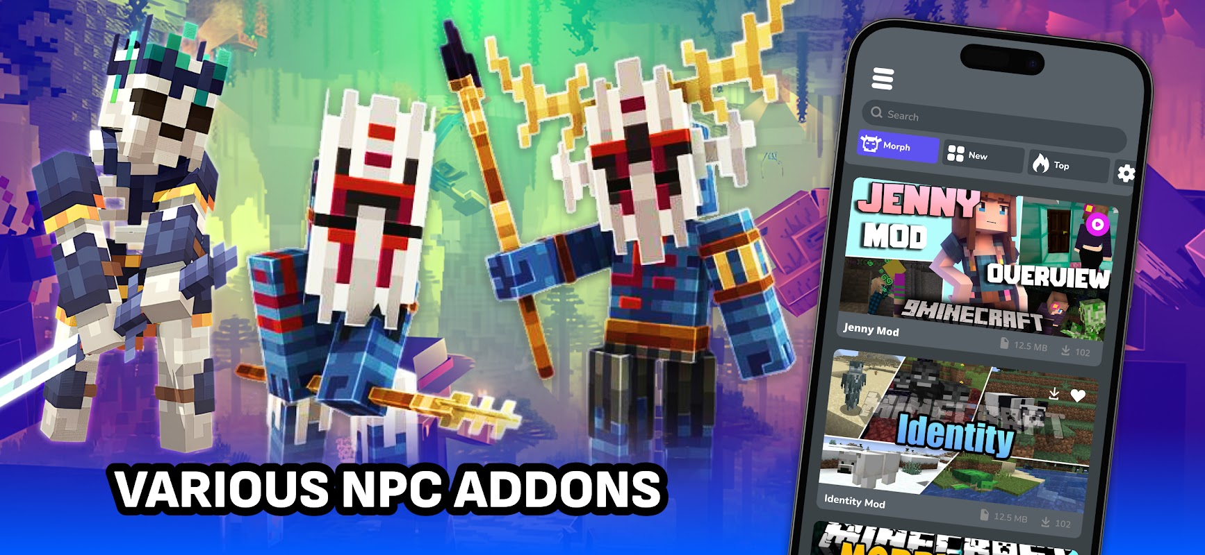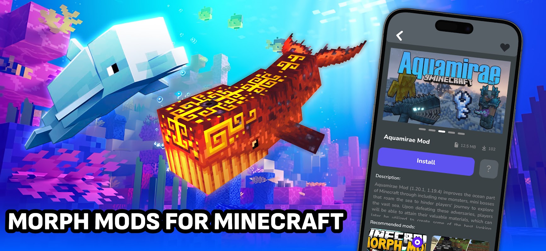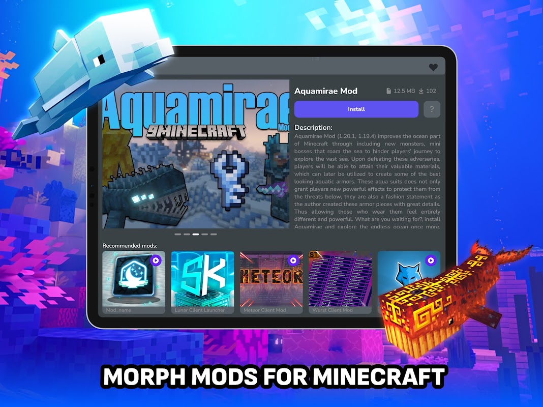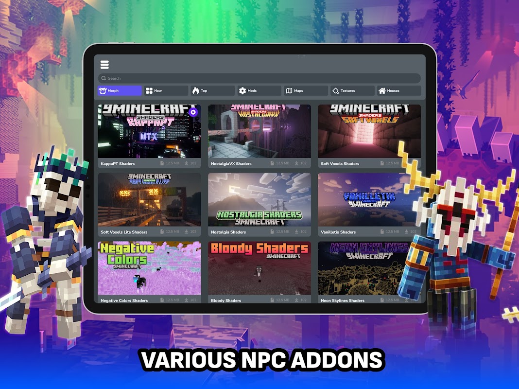 Morph Mods for Minecraft is a modern and unique solution that will open up incredible opportunities for you to improve and personalize your favorite MCPE game. The application includes a variety of morph mod & addons, mc textures, maps, buildings, shaders addons and much more to make your MCPE unique and inimitable. Each element adds new experiences and expands the boundaries of the gameplay! Also additionally download thousands of different maps, texture packs, houses, furniture, mc add-ons and much more! Improve your gaming experience with our modern catalog that has instant installation directly into your game!