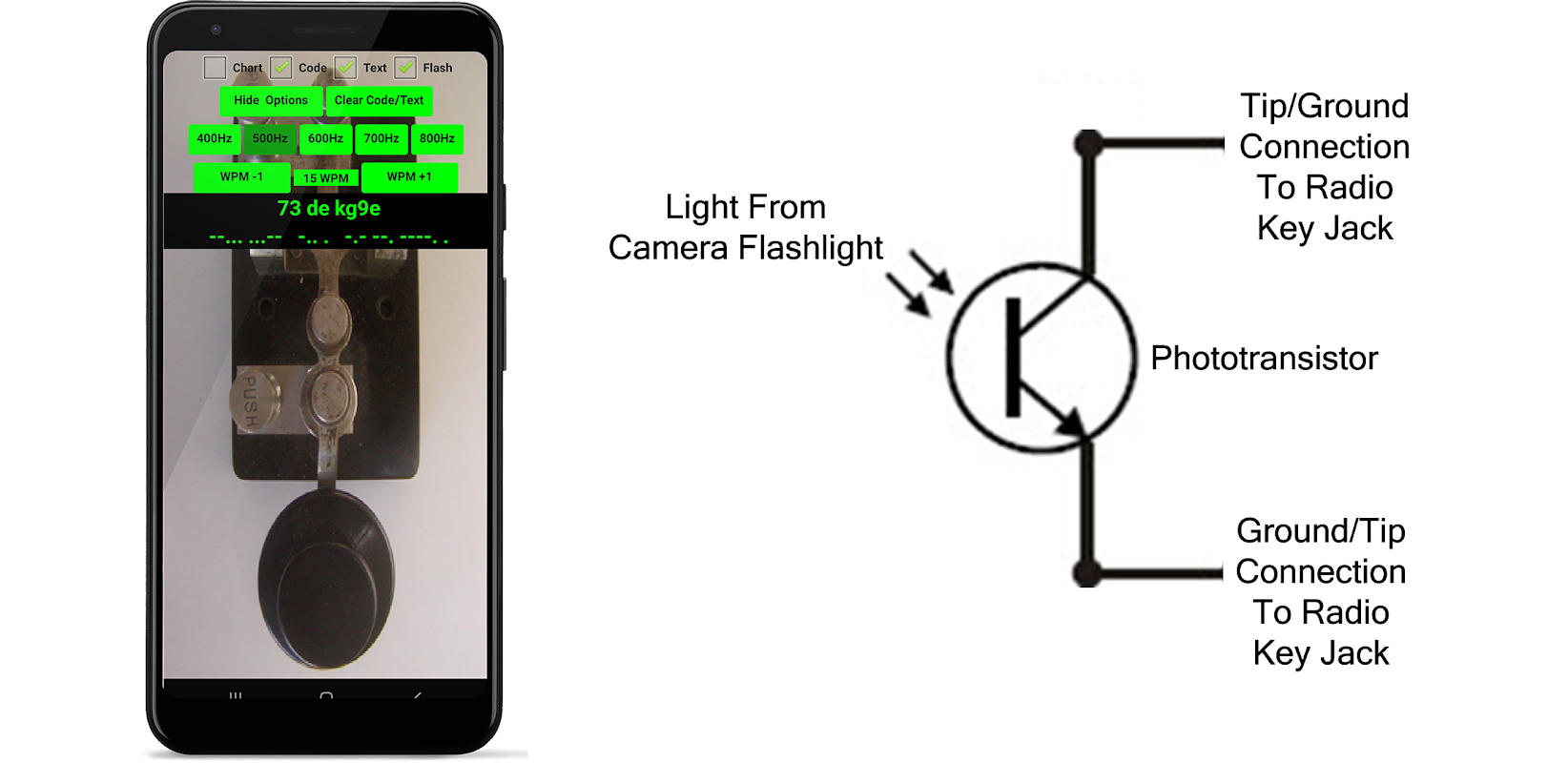 Practice sending International Morse code with this straight horizontal lever CW Morse code practice oscillator app for Android smartphones and tablets. This app is stand alone and DOES NOT directly interface with your radio to provide a keying device. However, you may use the app's flashlight feature, a phototransistor, and a 2-wire connector to straight key a transmitter.