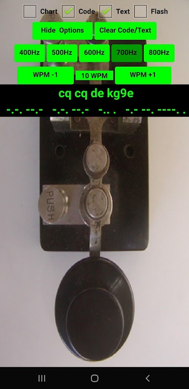 Settings include WPM, show/hide Morse code/text, choose sidetone 400Hz-800Hz. Adjust the WPM so that you can produce well formed DITs and DAHs at a comfortable speed. Press and hold the Clear Code/Text button to adjust CW and Text label font sizes.
