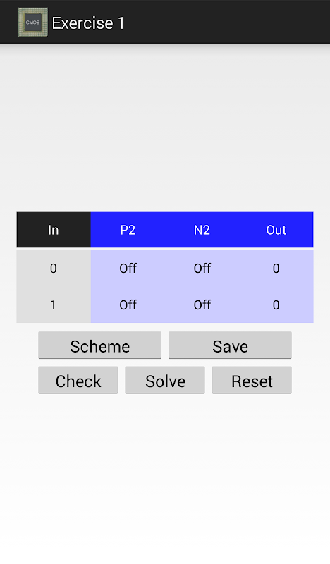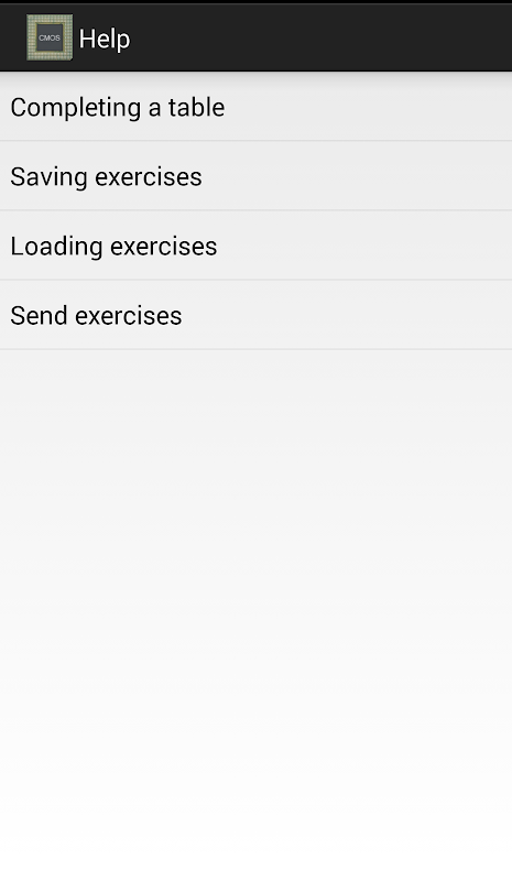 The user can save exercise solutions and send them by email, so that the receiver can load them in MOS Cicuits application. Basic manual (Help) for utilize this application is included.