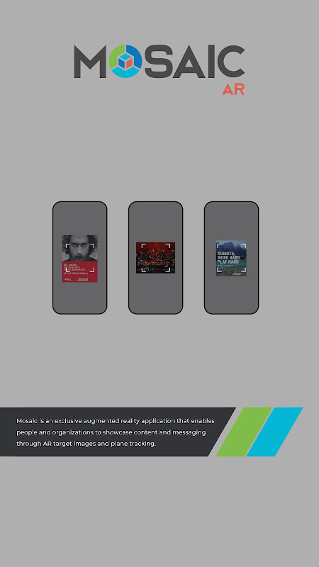 This augmented reality application uses a combination of native AR and third party software to create a public facing communication channel for people and organizations to showcase their content and messaging. Utilizing both target image and plane tracking AR, Mosaic is an exclusive platform for communicators to submit content that will be publically available to their target audiences. This user friendly experience combines basic AR functionality into a finely packaged content delivery tool.