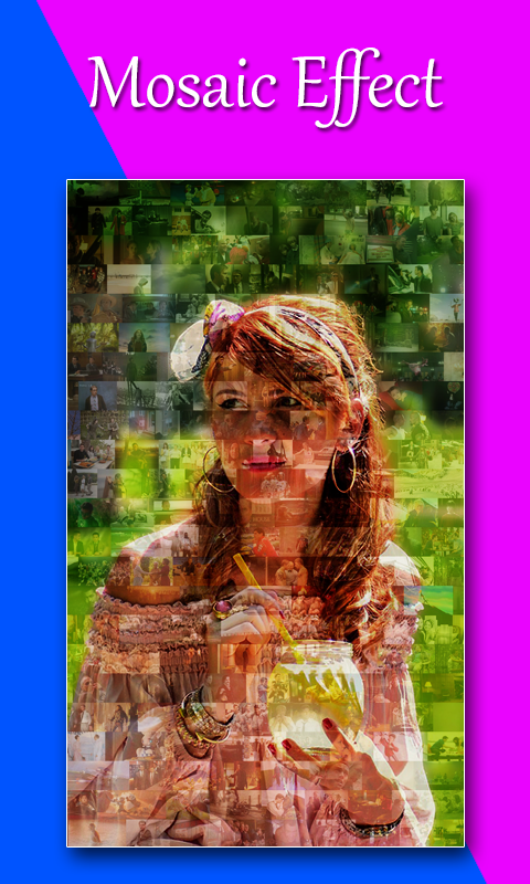Mosaic Effect : Mosaic Photo Effects, convert your photos into an Art. You can now make a Mosaic Photo just in some few steps. This Mosaic Making app makes high quality mosaic photo collages.