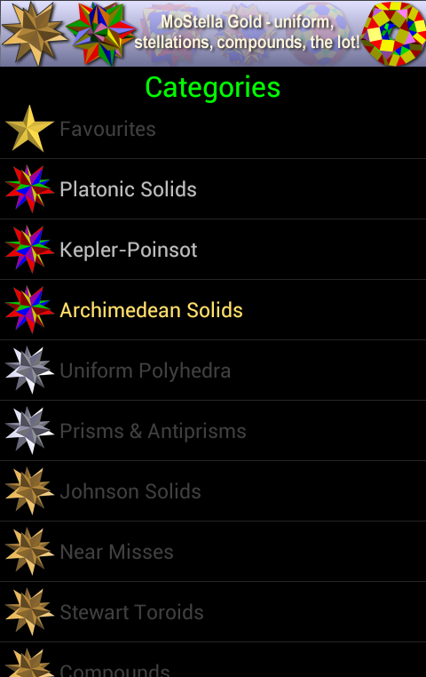 Go ad-free with MoStella Silver or Gold! MoStella Silver adds the remaining 54 non-convex uniform polyhedra and a collection of uniform prisms and antiprisms. MoStella Gold adds hundreds of other polyhedra including Johnson solids, near misses, stellations, compounds, geodesic spheres, Stewart toroids and more.