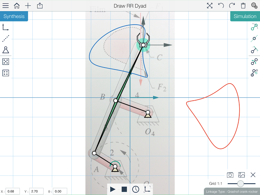 MotionGen is an iOS and Android app for synthesizing and simulating planar four-bar linkages.