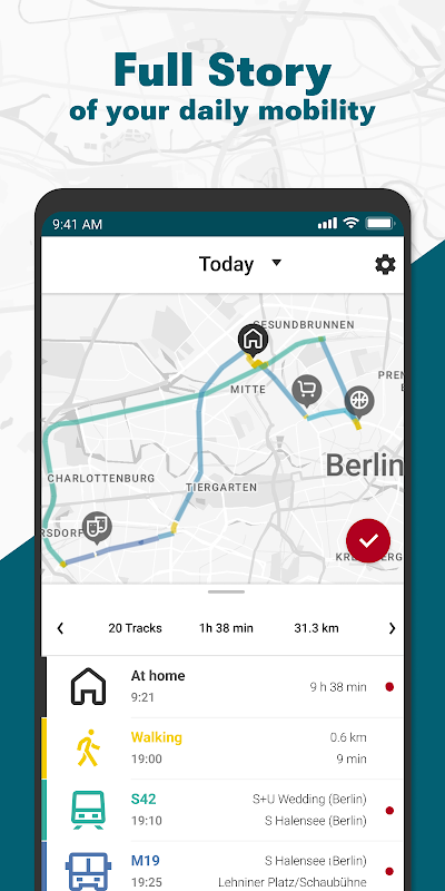 Keep an eye on your mobility. With motiontag you have your automatic mobility log book with you all the time. With the calendar you can review where you've been and how you got there. With the map you get an overview over every day. Through your personal statistics you find out which transport means were the fastest for you and which you used most often.