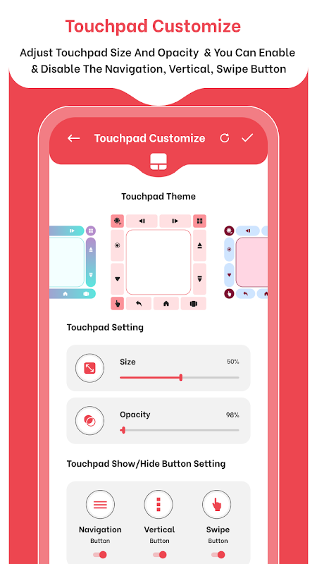 A customize touchpad settings with touchpad color, minimize color, long press color, swipe arrow color, notification color, navigation color, custom swipe colors too.