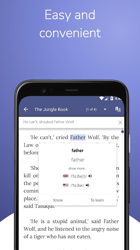* Book reader module. In this module, you can read books in the original in English with the translation of the sentence and each word separately. Just click on the word and you will see the full translation, along with the translation frequency, as well as the translation for different parts of speech verb, noun, adjective etc... All books are divided by genre (Detective, short story, novel, classic, etc.) and by levels (A1-C1). You can start reading books from scratch, starting from the easiest level and gradually increasing your vocabulary. Each word has a transcription and audio pronunciation. Add unknown words to the dictionary for learning.