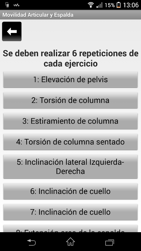 Esta aplicación presenta una serie de estiramientos y ejercicios para mejorar la movilidad articular de espalda y cuello. Consta de dos opciones de uso: clásica y la guiada por voz.