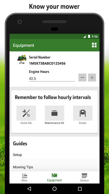 Keep your John Deere riding lawn mower running its best and know how you mow with the John Deere MowerPlus app. Simply scan your barcode or enter your serial number and the MowerPlus app is optimized for your specific mower. Ready for maintenance? You can order the Home Maintenance Kit – almost everything you need to perform maintenance for your specific mower – right from the app. Simple step-by-step instructions make performing maintenance quick and easy. Not a DIYer? Contact your dealer for service and support directly from the MowerPlus app.