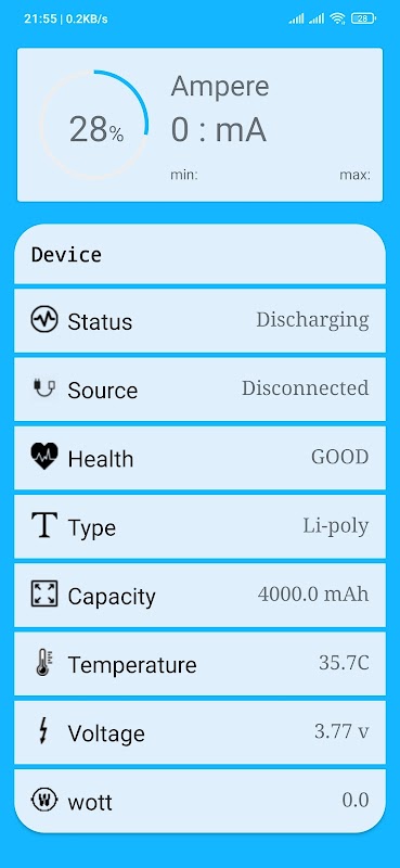 A program that allows knowing the condition of the battery and its charge meter by measuring the amperes, the intensity of the pilot, the watts and the temperature of the battery. The program provides information about the battery such as its capacity and the type of battery used