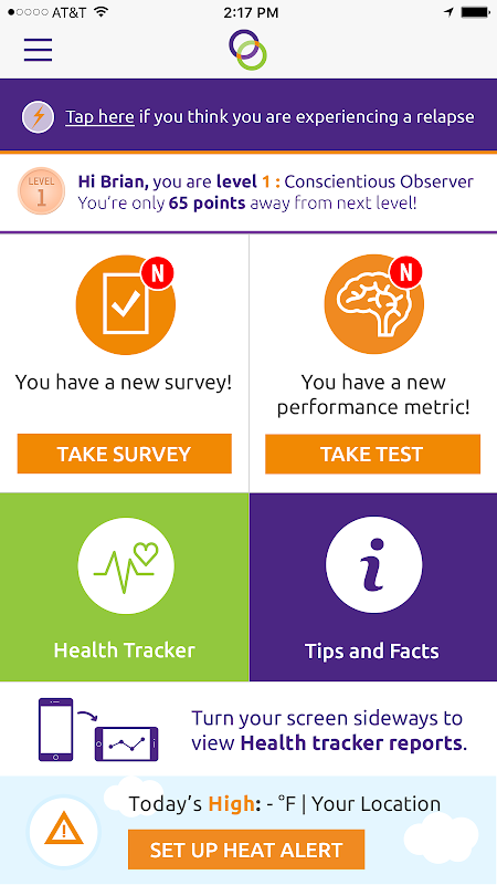 • Heat Alerts: Stay cool and receive notifications when the weather may increase the severity of your symptoms
