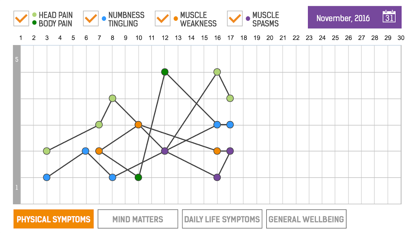 • Health Tracker: A convenient tool to monitor your daily MS symptoms and well-being