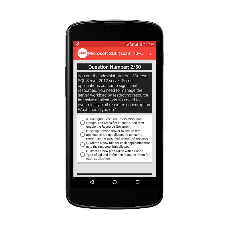 Practice for Administering MS SQL Database Infrastructure (Exam 70-764) App, and perform a simulation test to get prepared for your exam, and more than 50 questions with answers.