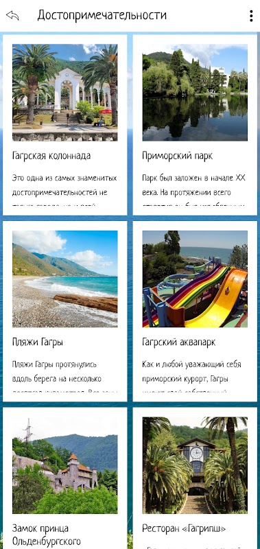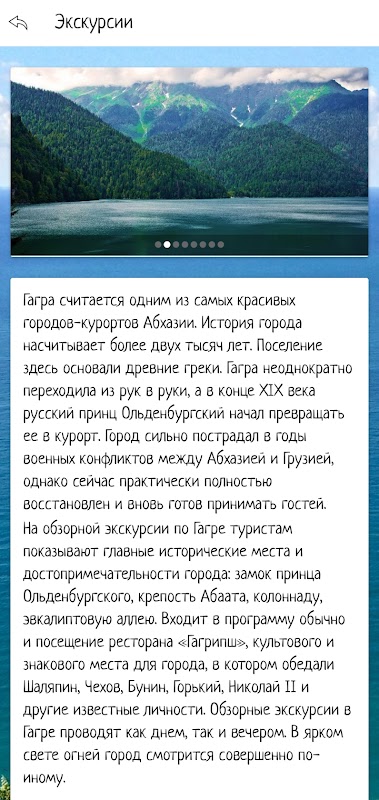 Dalam aplikasi, anda boleh membuat kenalan awal dengan bandar-bandar Abkhazia, pilih tempat untuk melancong dengan menonton pemandangan dan ulasan video. Aplikasi itu juga mengandungi maklumat mengenai agensi pelancongan dan hotel yang menawarkan perkhidmatan mereka di bandar terpilih.