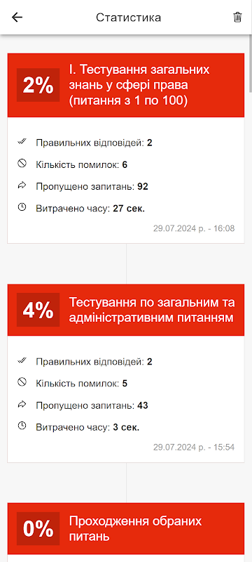 Anda boleh mengambil ujian dan mengkaji soalan sepenuhnya, dalam bahagian 100 soalan, dalam bahagian rawak 50 soalan, dalam bentuk mengerjakan kesilapan pada soalan di mana kesilapan dibuat, mengulang soalan yang dipelajari, mengkaji soalan di mana kesilapan telah dilakukan. Pilihan jawapan dikocok pada setiap ujian untuk memastikan kecekapan tinggi menghafal jawapan