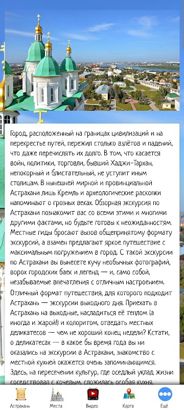 Dalam permohonan itu, anda boleh membuat kenalan pertama dengan bandar Astrakhan, memilih tempat untuk perjalanan dengan melihat pemandangan dan ulasan video. Aplikasi itu juga mengandungi maklumat mengenai agensi pelancongan dan hotel yang menawarkan perkhidmatan mereka di Astrakhan.