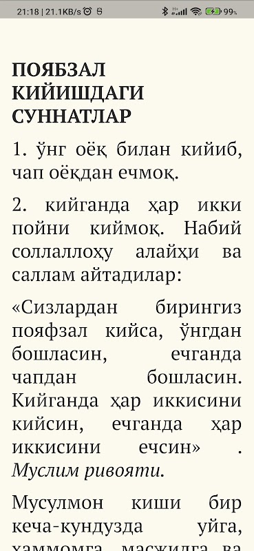 * Ushba dasturda arabcha mantlar ҳam keltirilgan. Shriftlarimiz faқat Ўzbek Cyrillic alifbosiga mўlzhallanganligi sabablik bazi Android uskunalarda arabcha matnlar Yakshi chiқmay қolyapti. Kelgusida buni echimini topishga қilamiz harakat, insya Alloҳ.
