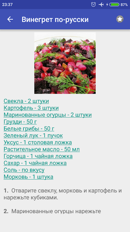 Винегрет — популярный в России и других странах бывшего СССР салат из отварных свёклы, картофеля, фасоли, моркови, а также солёных огурцов и зелёного или репчатого лука. Относится к закусочным холодным блюдам.