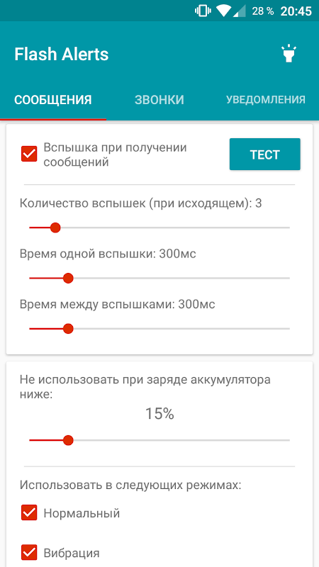 + Настройка выключения вспышки при определенном заряде батареи, а так же при определенном режиме звука (бесшумный, вибрация, нормальный)