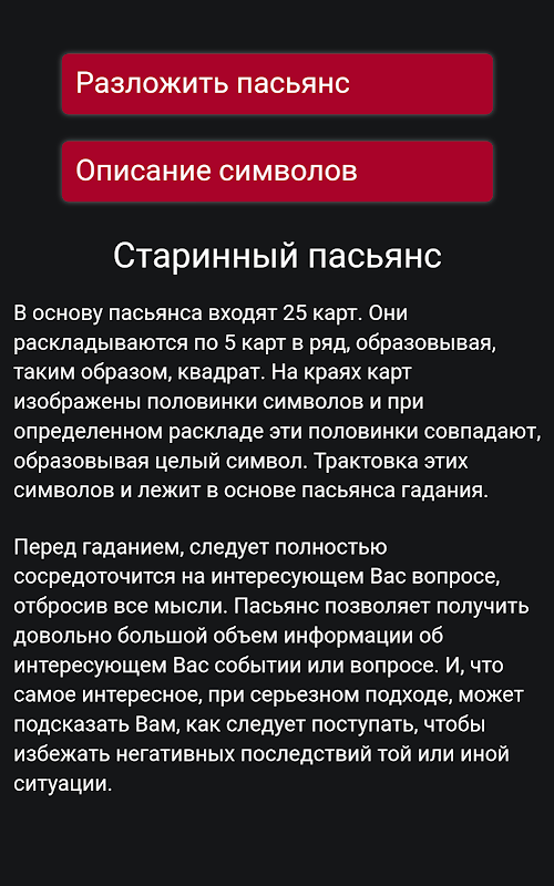 Solitaire Kuno adalah cara mencari rezeki yang tidak biasa, ia juga disebut sebagai nasib baik Indian Solitaire. Penceritaan ini mencerminkan kebijaksanaan popular, simbolnya dekat dan dapat difahami oleh setiap orang dan berasal dari situasi kehidupan, dan bukan dari keajaiban sihir, penafsiran beberapa peramal lain. Nasib baik mencerminkan kebijaksanaan popular dan kebanyakan mencerminkan kenyataan kita. Ini adalah keberuntungan yang mana khabar angin popular mengaitkan sifat mencerminkan masa kini dan meramalkan masa depan. Solitaire nasib baik terdiri daripada 25 kad. Kad dibentangkan dalam 5 keping di setiap baris, ternyata, 5 baris 5 kad. Di bahagian tepi kad terdapat separuh daripada pelbagai simbol. Apabila bahagian ini bertepatan, dan simbol keseluruhan terbentuk, tafsiran simbol kebetulan muncul, yang merupakan asas solitaire. Sebelum meneka, kosongkan fikiran anda dan ajukan soalan atau fikirkan peristiwa yang ingin anda teka, anda perlu menumpukan perhatian sepenuhnya pada masalah yang anda minati. Dengan pendekatan yang serius, keberuntungan akan dapat memberitahu anda apa yang harus dilakukan untuk mengelakkan akibat yang tidak menyenangkan dalam pelbagai situasi.