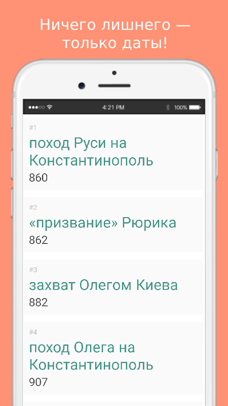 Aplikasi ini akan membolehkan anda mengingati semua tarikh utama dalam sejarah Rusia. Cukup pilih tempoh yang diingini, ingat tarikhnya, dan kemudian, ambil ujian sederhana. Matlamat anda adalah untuk mempelajari semua tarikh untuk tempoh yang dipilih sebanyak 100%!