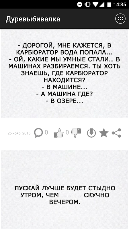 Понравившиеся записи можно комментировать и оценивать. Все понравившиеся картинки можно сохранять в галерее устройства в папке приложения. Ты можешь делиться записями с друзьями через социальные сети Facebook, Вконтакте, Одноклассники, Viber, WhatsApp а так же другие установленные на устройстве приложения. Ну и конечно, ты можешь оставлять лайки и сохранять записи в избранное.