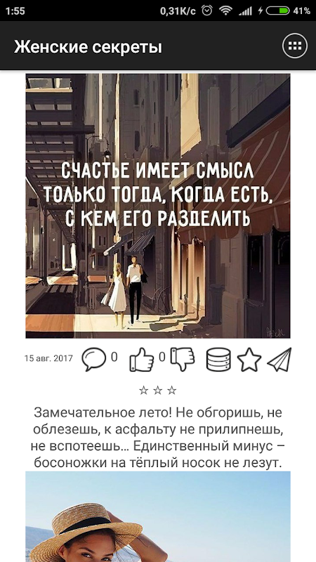 Понравившиеся записи можно комментировать и оценивать. Все понравившиеся картинки можно сохранять в галерее устройства в папке приложения. Ты можешь делиться записями с друзьями через социальные сети Facebook, Вконтакте, Одноклассники, Viber, WhatsApp а так же другие установленные на устройстве приложения. Ну и конечно, ты можешь оставлять лайки и сохранять записи в избранное.