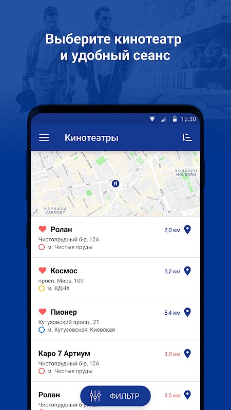 - Penapis mudah: format sesi - Imax, 3D, 2D, bahasa dan genre filem dengan kemungkinan menggabungkan pilihan