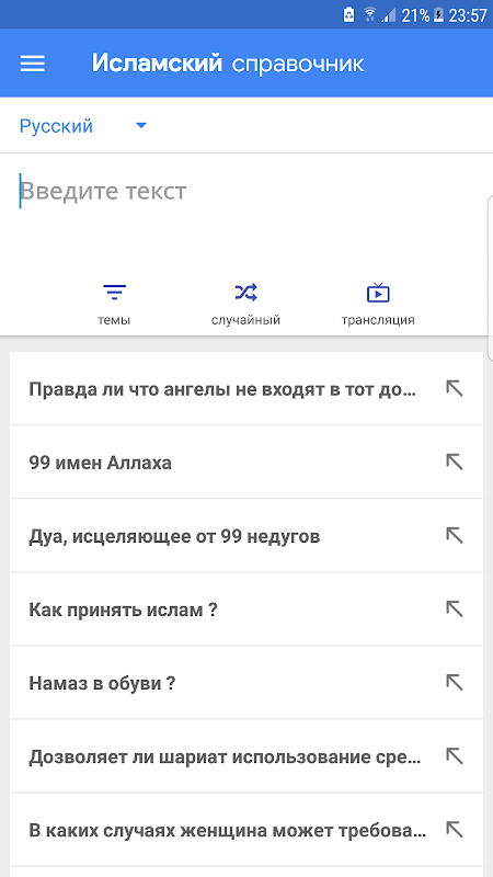 Dengan aplikasi Buku Panduan Islam, anda akan mempelajari segala sesuatu mengenai Islam: Cukup masukkan kata kunci soalan anda dalam carian dan pilih topik yang menarik minat anda dari hasilnya.