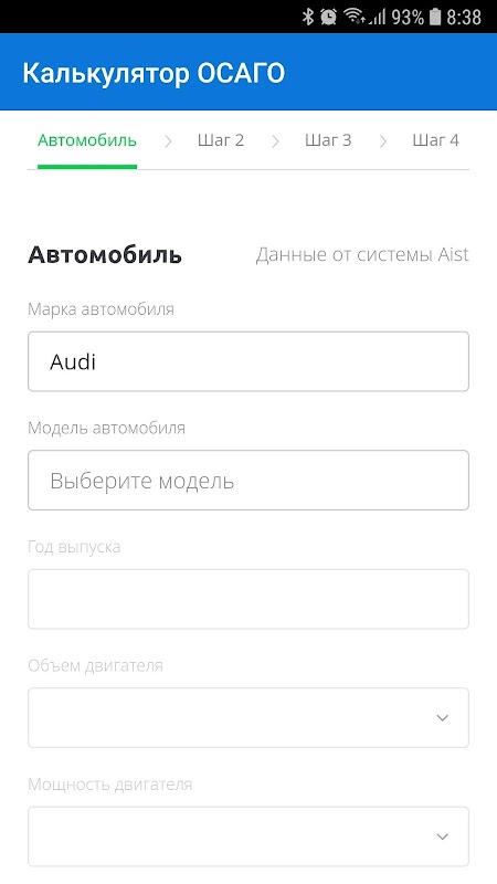 Untuk membeli lebih lanjut polisi menggunakan aplikasi kami, anda perlu menentukan pembuatan dan model kereta, menentukan maklumat mengenai pemilik, umurnya, pengalaman memandu dan memilih tawaran terbaik di kalangan syarikat insurans terkemuka.
