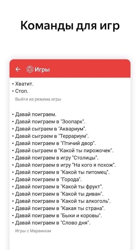 Pembantu Suara itu sendiri TIDAK MEMBANGUN aplikasi "Perintah untuk Marvin" ini; untuk menggunakan Marvin, anda perlu memuat turun aplikasi "MTS Marvin" - pembantu suara ada di dalamnya. Anda boleh menggunakan arahan yang ditunjukkan dalam aplikasi MTS Marvin dan di ruangan pintar dari MTS untuk melancarkan permainan dan mendapatkan maklumat yang berguna.