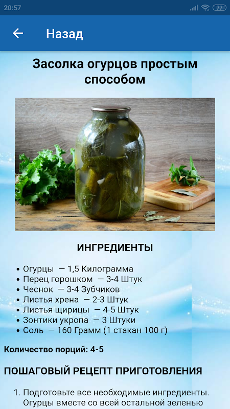 Наши рецепты с фото консервированных огурцов не содержат каких-то экзотических ингредиентов, поэтому любой сможет с легкостью их повторить в домашних условиях. В нашем приложении вы найдете множество рецептов заготовки огурцов на любой вкус. Также вы научитесь готовить малосольные огурцы, которые будут готовы к употреблению уже через несколько дней.