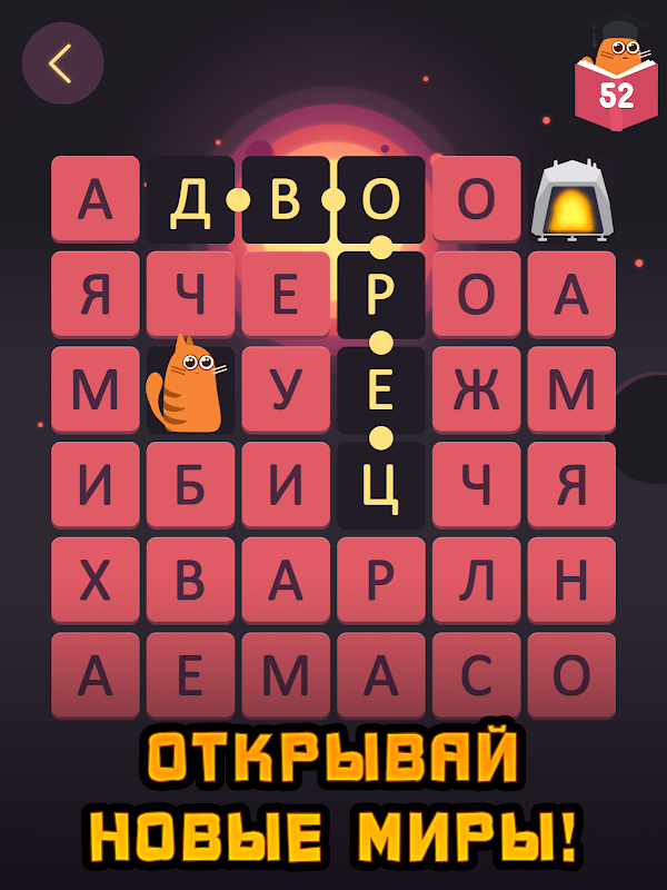 В игре Котослов мы объединили любимые многими филворды с играми, где нужно провести героя по лабиринту. Всe очень просто - необходимо из букв составлять слова, которые должны сложиться в маршрут, по которому наш кот пройдет до нужной точки. Раз, два, три и вот вы уже на следующем уровне!