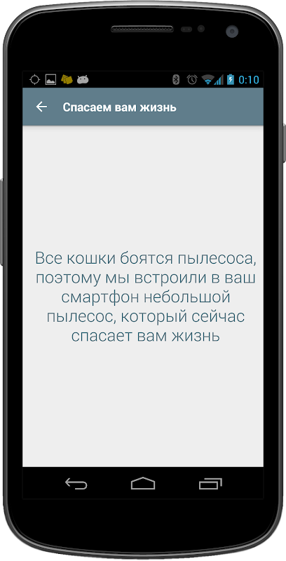 Всем известно, что кошки боятся работающего пылесоса. Приложение превращает смартфон в пылесос, тем самым отпугивает котов =)