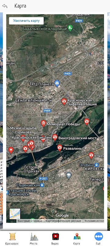 Dalam aplikasi, anda boleh membuat kenalan awal dengan Krasnoyarsk, memilih tempat untuk perjalanan dengan melihat pemandangan dan ulasan video. Aplikasi ini juga mengandungi maklumat mengenai agensi pelancongan dan hotel yang menawarkan perkhidmatan mereka di Krasnoyarsk.