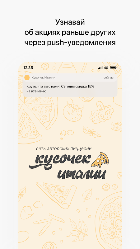 "A Piece of Italy" ialah aplikasi untuk penghantaran makanan di Krasnodar!