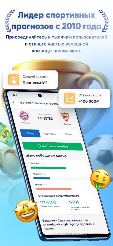 Скачай бесплатное приложение с лучшими прогнозами на спорт от беттеров и принимай участие в турнирах прогнозистов. Участие может принимать любой желающий, достаточно зарегистрироваться и начать давать свои точные прогнозы на любой чемпионат и соревнование доступные в 1xstavka, pin up, мелбет, Pari, бетсити, олимпбет, мостбет, марафон, бет бум или в fonbet! Для анализа матчей у нас есть для тебя спортивная статистика до матча, новости спорта и беттинга, а также результаты соревнований по всем видам спорта в режиме реального времени.